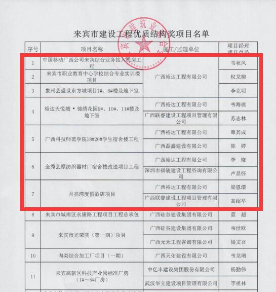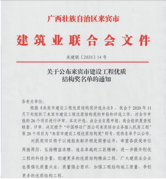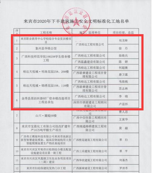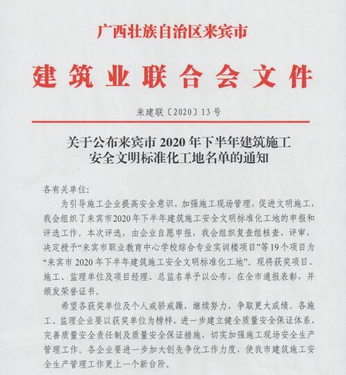 12月15日,从来宾市建筑业联合会传来喜讯,裕达工程的来宾职业教育中心学校综合专业实训楼项目、象州县华锦公馆等共6个项目被评为来宾市2020年下半年安全文明标准化工地,以及裕达工程的中国移动广西公司来宾综合业务接入机房工程、裕达天悦城·锦绣花园9#、10#、11#楼及地下室等共7个项目被评为来宾市建设工程优质结构奖。