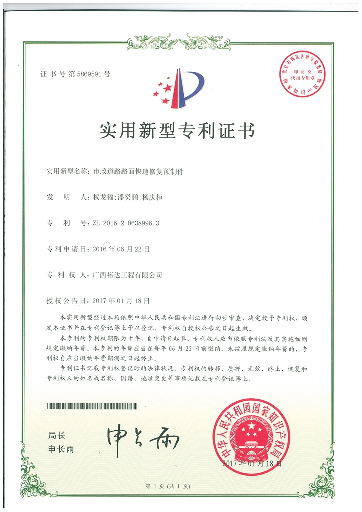 2017年实用新型专利证书(市政道路路面快速修复预制件)