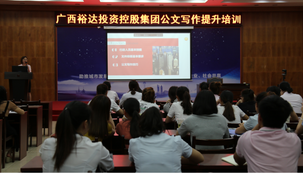为进一步提高日常公文的写作能力,增强员工的公文写作素质,掌握常用快速的写作方法和注意事项。培训中心于2018年5月23日晚上在集团七楼大会议室组织开展公文写作提升培训。参训对象为2018年入职的部分新员工及部分后备梯队人才,共六十多人。投资公司、武宣公司、地产四公司等通过视频参与培训。本次培训由行政管理中心总裁办副主任韦焦妮担任主讲。