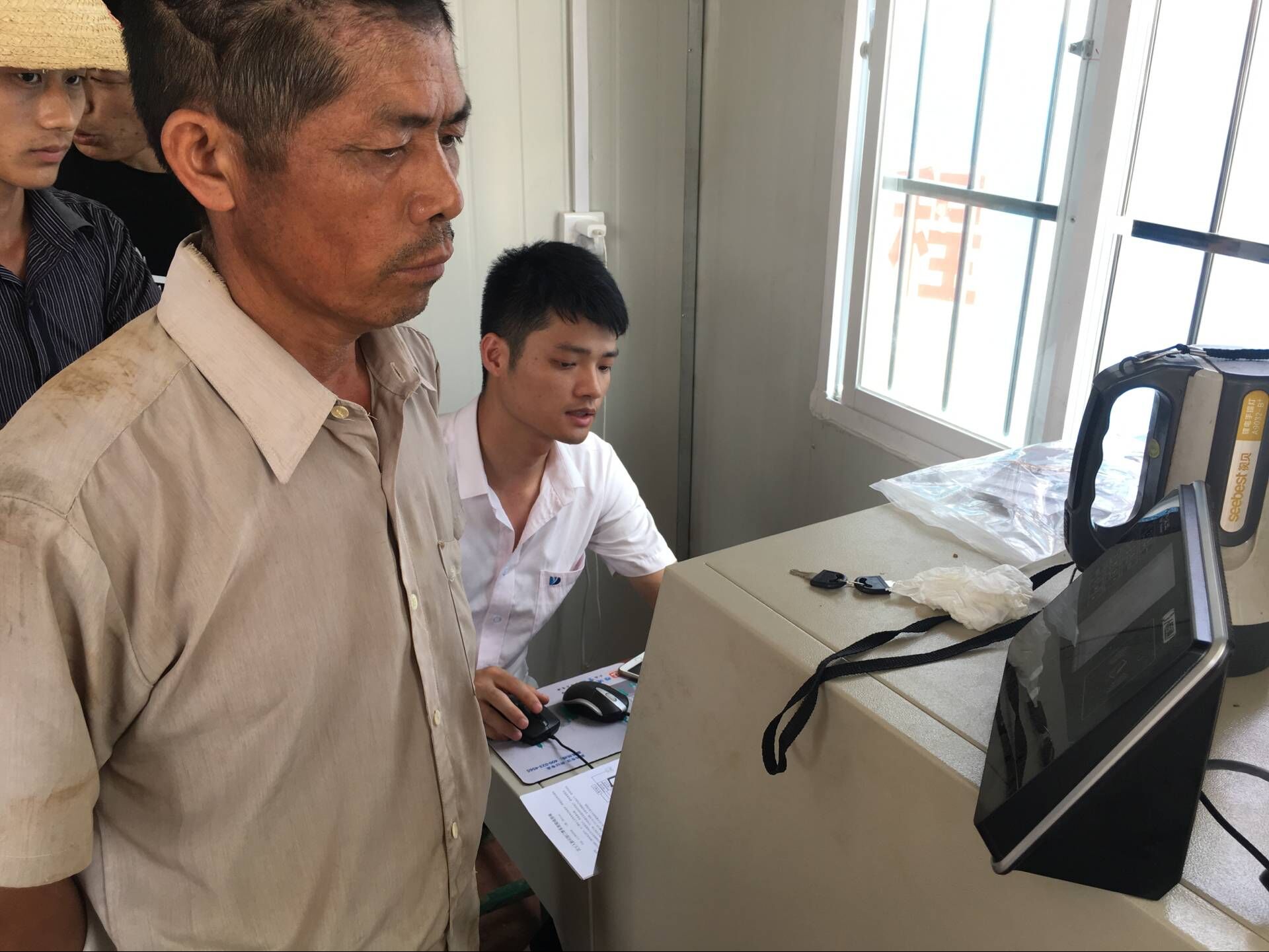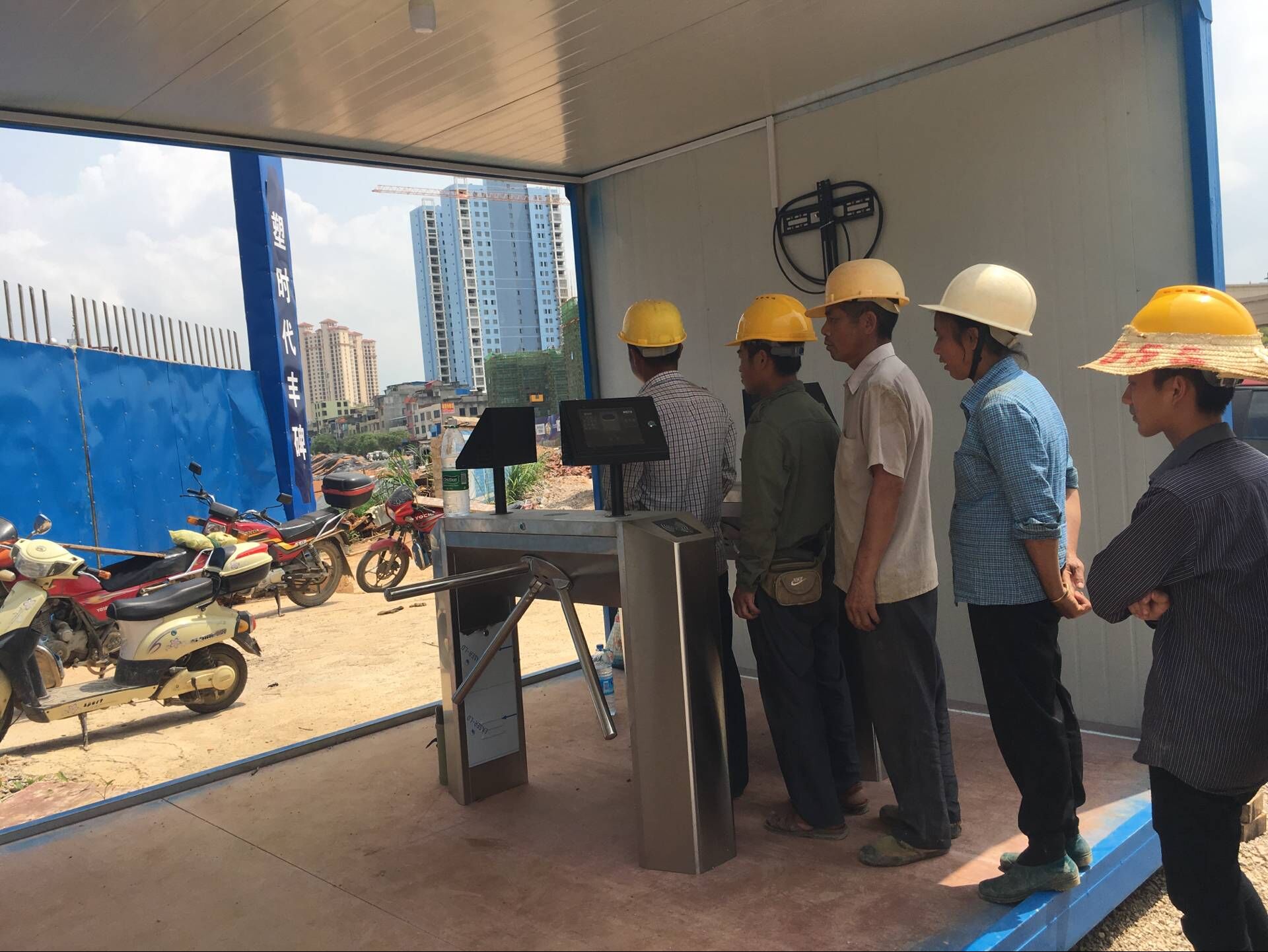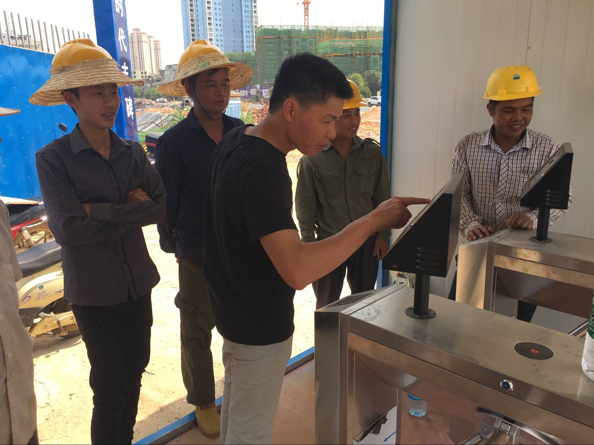 图为工人正在试行人脸识别进场