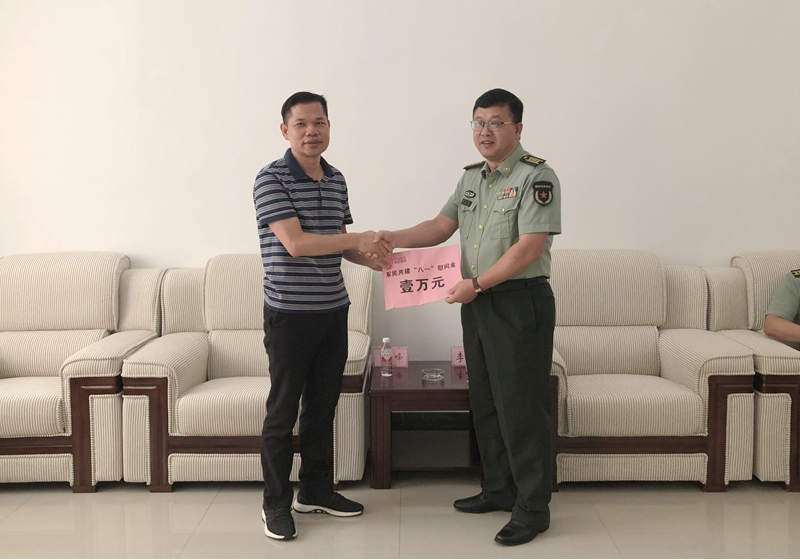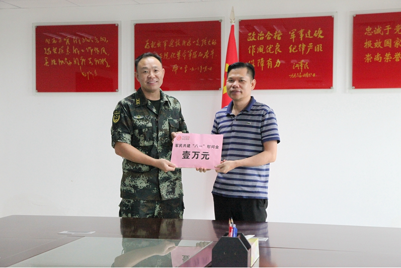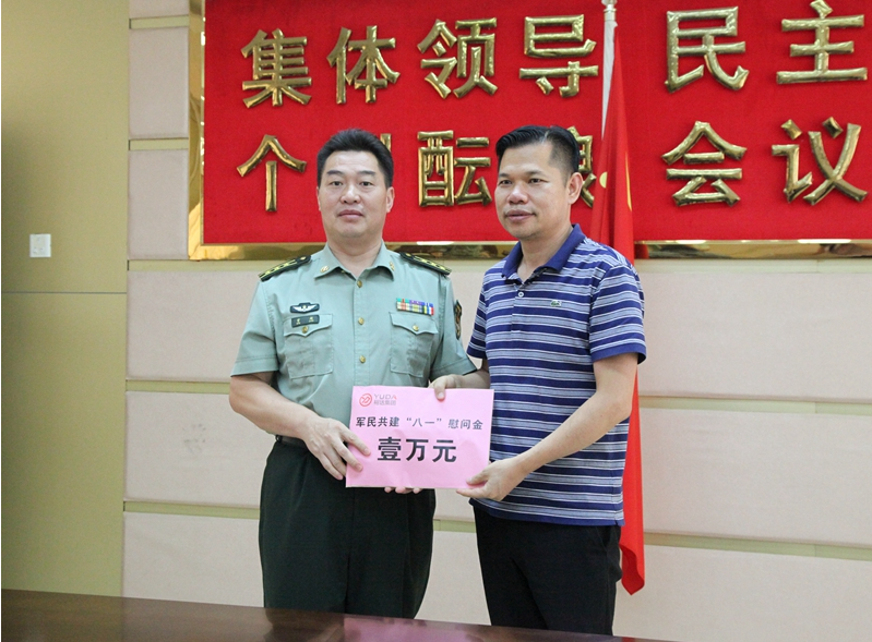 在“八一”建军节来临之际,为增进与部队官兵的情感交流,共话军民鱼水情谊,730日,由集团副总裁梁锋、总裁助理杨贻敏、杨硕、行政副总监罗桂平、行政部经理覃婷婷等一行领导组成慰问团,先后到武警来宾支队、广西陆军预备役兵师第一团、来宾市消防支队、中国人民解放军广西来宾军分区开展八一慰问活动,向部队官兵表达了崇高的敬意并送去节日祝福。