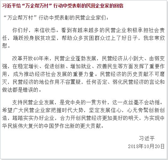 今年10月,全国工商联、国务院扶贫办等单位开展了“万企帮万村”行动先进民营企业表彰活动,表彰了100家民营企业。近日,受到表彰的民营企业家给习近平总书记写信,汇报了参与“万企帮万村”行动的体会,表达了继续为脱贫攻坚贡献力量的决心。1020日,习总书记给“万企帮万村”行动中受表彰的民营企业家回信,对民营企业踊跃投身脱贫攻坚予以肯定,勉励广大民营企业家坚定发展信心,踏踏实实办好企业。