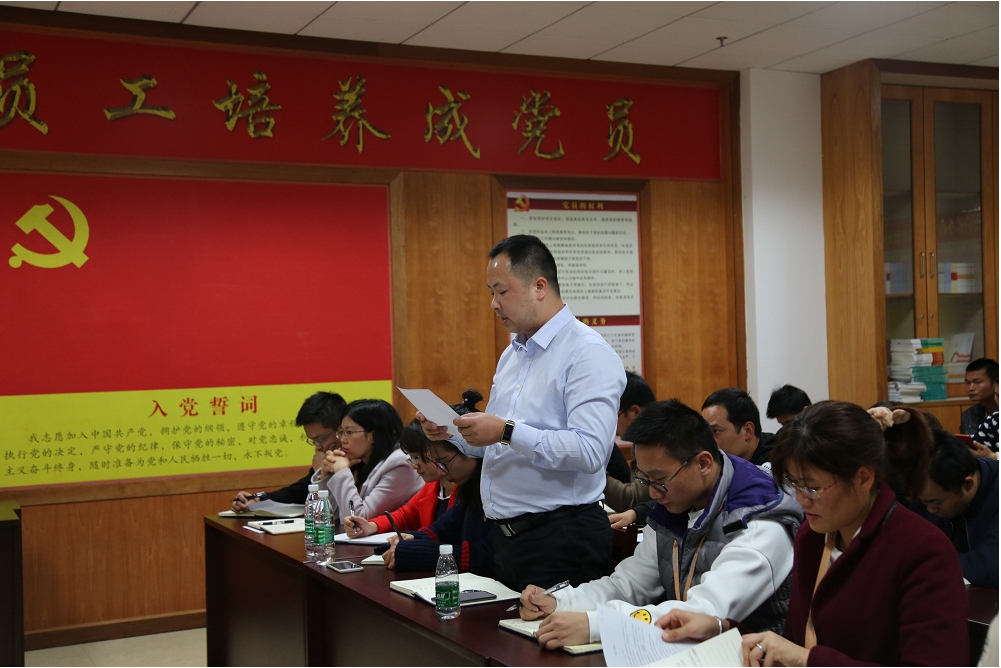 会议第一项议程为讨论票决权芬、杨峰两名同志预备党员转正事宜。两名预备党员向大会汇报个人在预备期间的个人情况等,随 后,支部委员会对两名预备党员在预备期间的教育和考察情况,提出能否转为正式党员的意见,两名入党介绍人及其他与会党员就两名同志在预备期间的表现发言个人意见。经过充分讨论,大家一致认为,两名同志具备了一名正式党员的条件,一致同意其转正,通过民主投票表决,全票通过了两名预备党员转为正式党员的决定。会议进行第二项议程为讨论票决吸收杨硕、黄雄光两名同志为预备党员。按照发展党员的程序要求,两位发展对象分别向大会汇报各自的入党动机、对党的认识、个人表现等,并表达了加入中国共产党的强烈愿望,党支部书记谢家伟代表支部报告了两位同志的考察情况,入党介绍人分别就两位同志在培养考察阶段中各方面的表现发表意见,与会党员进行了充分讨论,大家一致认为,两位同志各方面的表现都符合一名党员的标准,大会最后投票表决,全票通过接纳两位同志为中共预备党员。