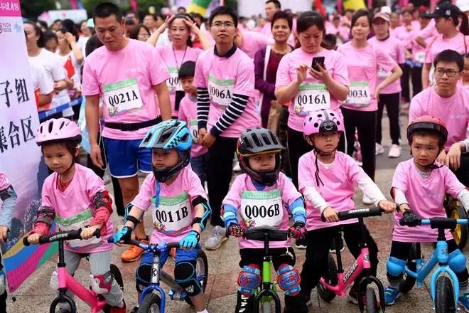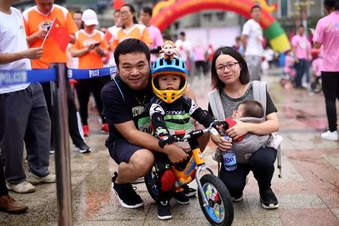 比赛现场有一组特别有意思的家庭选手,2岁的漓骑儿童平衡车小骑士吴桐宇和爸爸妈妈及4个月的弟弟,一家四口专程从桂林来到金秀参加比赛,吴桐宇骑着他心爱的儿童平衡车在爸爸妈妈和抱在怀里的弟弟的陪同下,一家四口共同参与五公里的马拉松挑战。