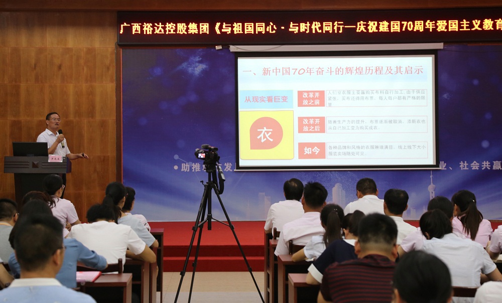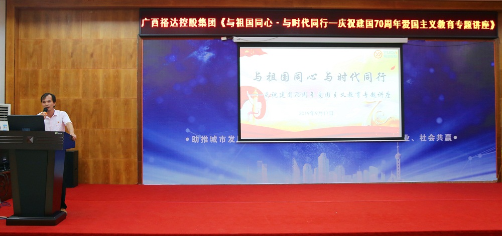 2019年是新中国成立70周年,也是集团公司成立15周年,在祖国70岁诞辰即将到来之际,为加强集团员工爱国爱党精神文明建设,加强集团党员思想政治建设,充分发挥党建引领作用,2019年9月17日晚7点集团党支部、来宾市兴宾区城北街道党工委联合邀请来宾市党校罗克良副教授到集团公司开展“与祖国同心.与时代同行”庆祝建国70周年爱国主义教育专题讲座,集团副总裁乔景坤、集团行政总监黄玲艳、集团党支部书记谢家伟及支部党员、预备党员、集团总部各中心、各公司主管级及以上人员200多人参加活动,异地子分公司视频参训,城北街道党工委组织干事卢玉妮受邀参加活动。