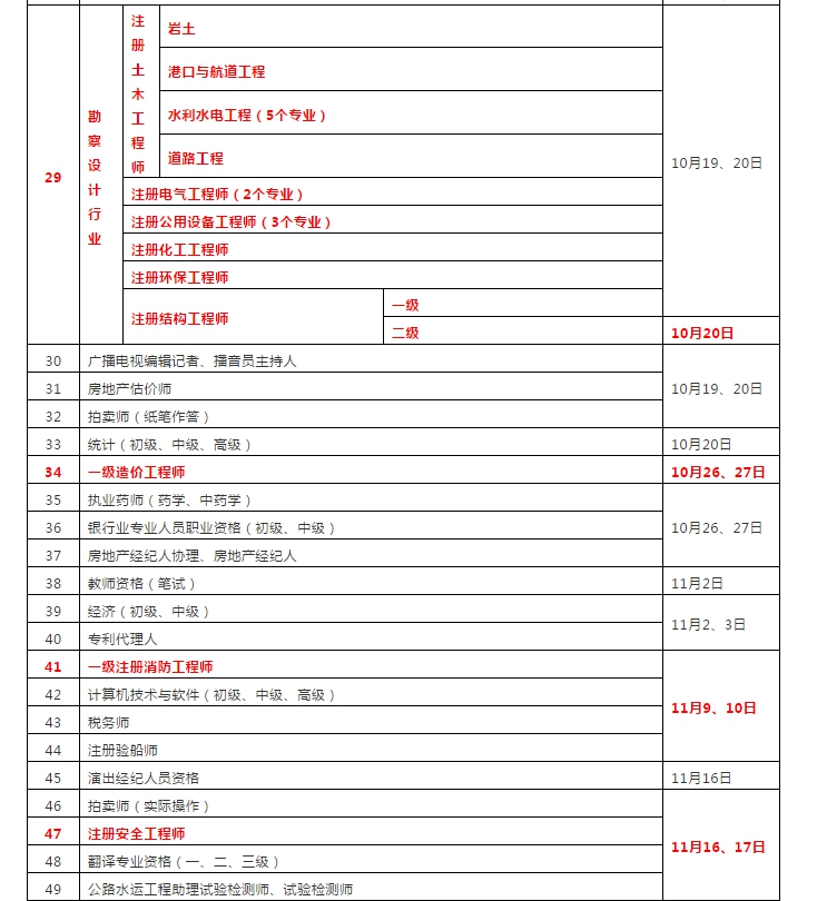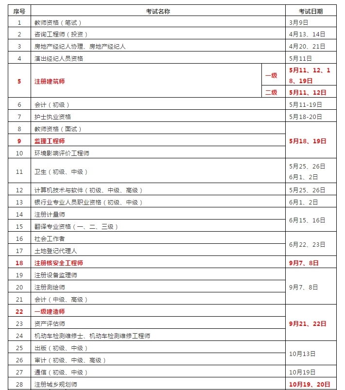 2018年12月20日,人力资源社会保障部发布《关于2019年度专业技术人员资格考试计划及有关事项的通知》,一级建造师、一级造价工程师、注册建筑师、监理工程师、注册土木工程师、注册结构工程师等在列。相比2018年,2019年一级建造师、注册建筑师考试时间推迟了一周。