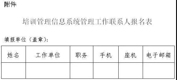 请各省级住房城乡建设主管部门确定1名工作联系人,填写《培训管理信息系统管理工作联系人报名表》,于2018年12月14日前报送我部执业资格注册中心,并发送电子版。