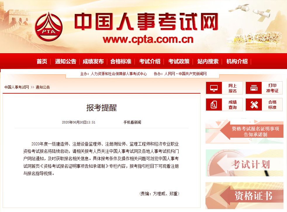 2020年度一级建造师、注册设备监理师、注册测绘师、监理工程师和经济专业职业资格考试报名将陆续启动,请相关报考人员关注中国人事考试网及各地人事考试机构门户网站通知,及时获取报名相关信息。