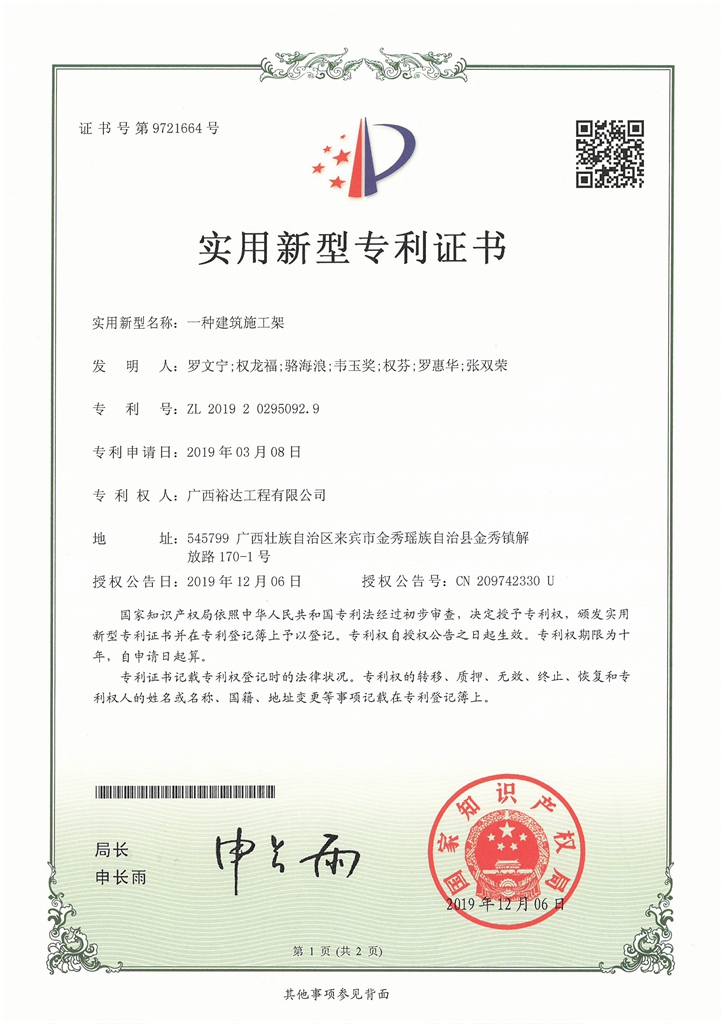2019年实用新型专利证书(一种建筑施工搬运车)1