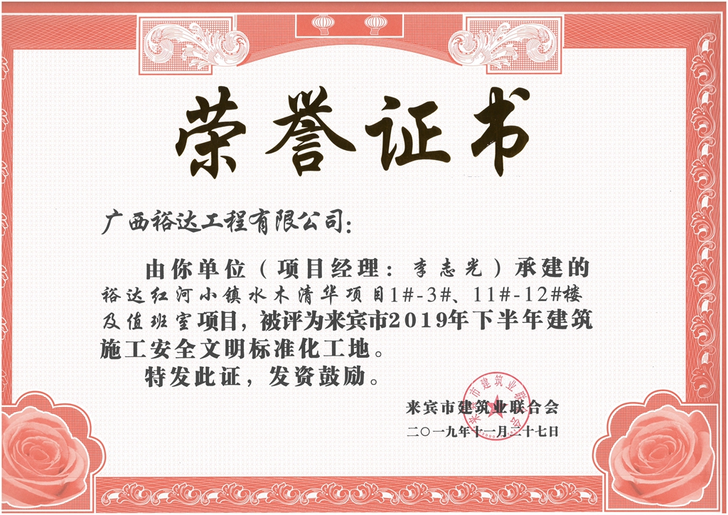 榆林春天7#楼、8#楼及地下室项目被评为来宾市2019年下半年建筑施工安全文明标准化工地(项目经理:韦冬)